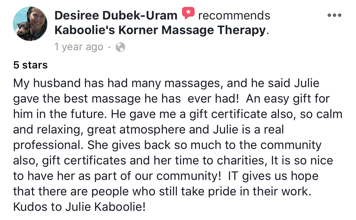 I am Julie "Kaboolie" Coker, LMT, NMT, CCT. (Licensed Massage Therapist, Neuromuscular Massage Therapist, Certified Cupping Therapist).